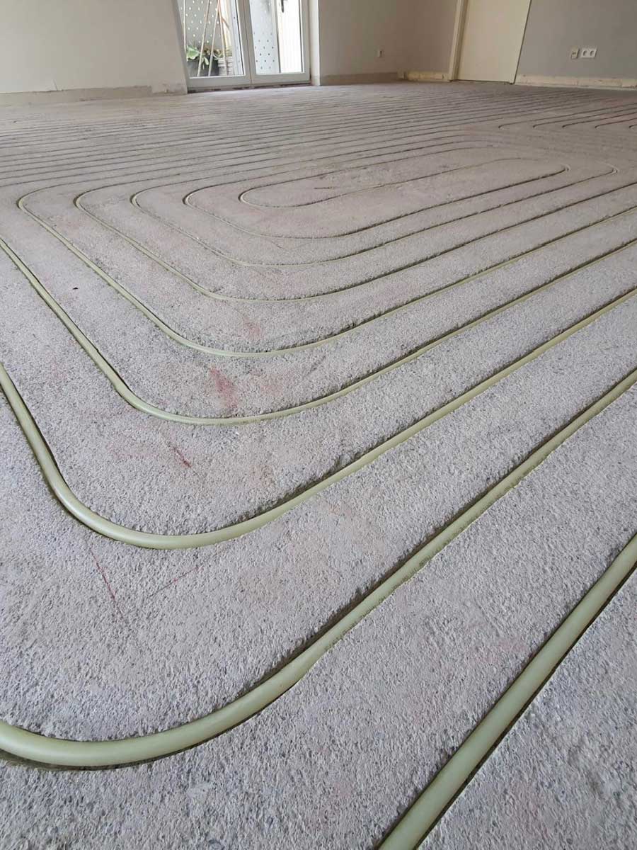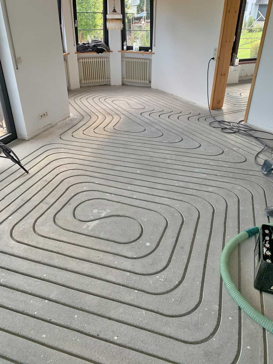 Mit unserer speziellen Fräse wurden die dünne Kanäle in den vorhandenen Estrich eingefräst. In die gefrästen Kanäle wurden die Fußbodenheizungsrohre verlegt und im Anschluss an den Heizkreisverteiler angeschlossen. Was beim Fräsen an Schleifstaub anfällt, fängt ein integrierter speziell dafür angefertigter Industriestaubsauger ein. So kann anschließend direkt mit dem Verlegen des neuen Bodenbelags begonnen werden.