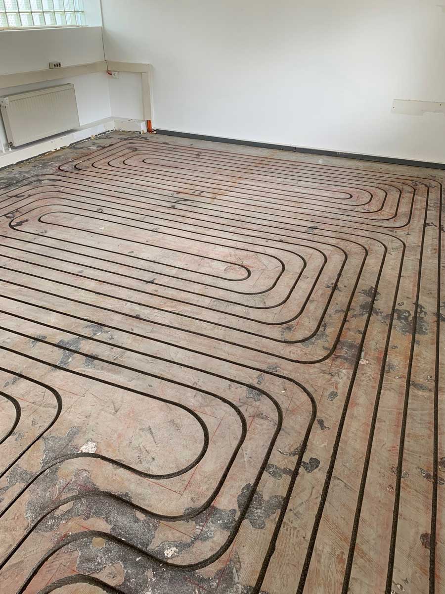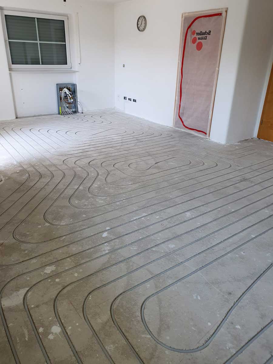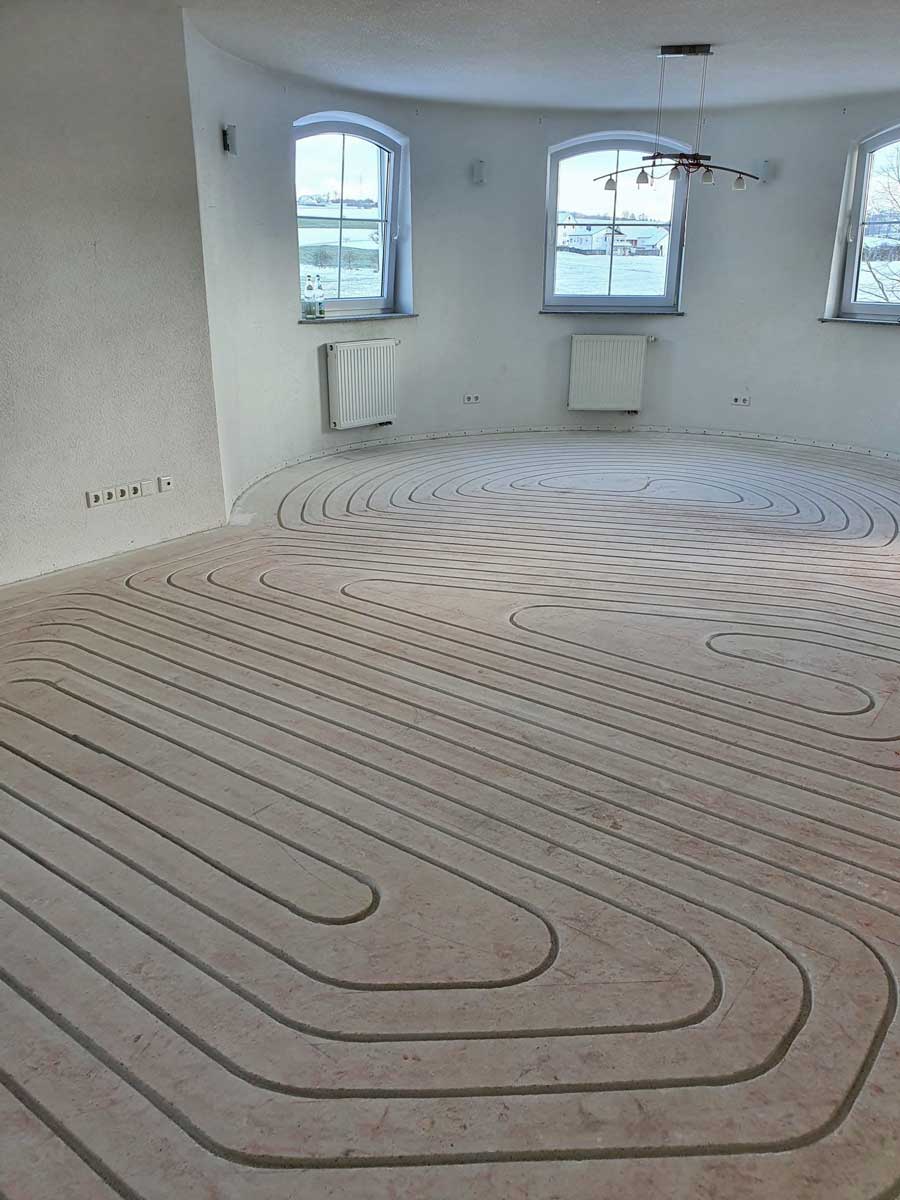 Mit unserer speziellen Fräse wurden die dünne Kanäle in den vorhandenen Estrich eingefräst. In die gefrästen Kanäle wurden die Fußbodenheizungsrohre verlegt und im Anschluss an den Heizkreisverteiler angeschlossen. Was beim Fräsen an Schleifstaub anfällt, fängt ein integrierter speziell dafür angefertigter Industriestaubsauger ein. So kann anschließend direkt mit dem Verlegen des neuen Bodenbelags begonnen werden.